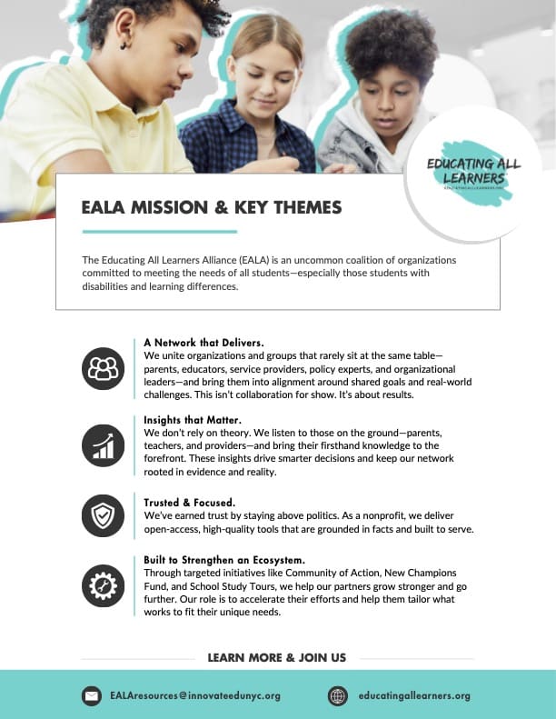 EALA represents a dynamic alliance of non-partisan groups deeply committed to the success of students, especially students with disabilities. While advocacy may be an aspect of partners’ work, EALA does not take a position on policy issues.