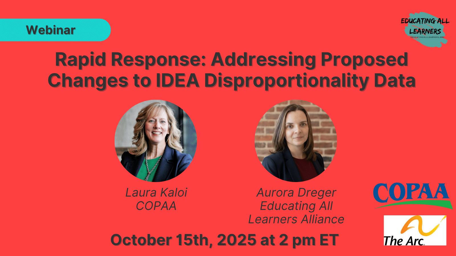 Join EALA,m The Arc, and COPAA for a 30-minute rapid-response webinar on the proposed federal changes to special education data collection (significant disproportionality data). This session will provide a clear overview of significant disproportionality, the data and its purpose, explain the potential impact of the proposed changes, and discuss actionable steps that educators, and families […]